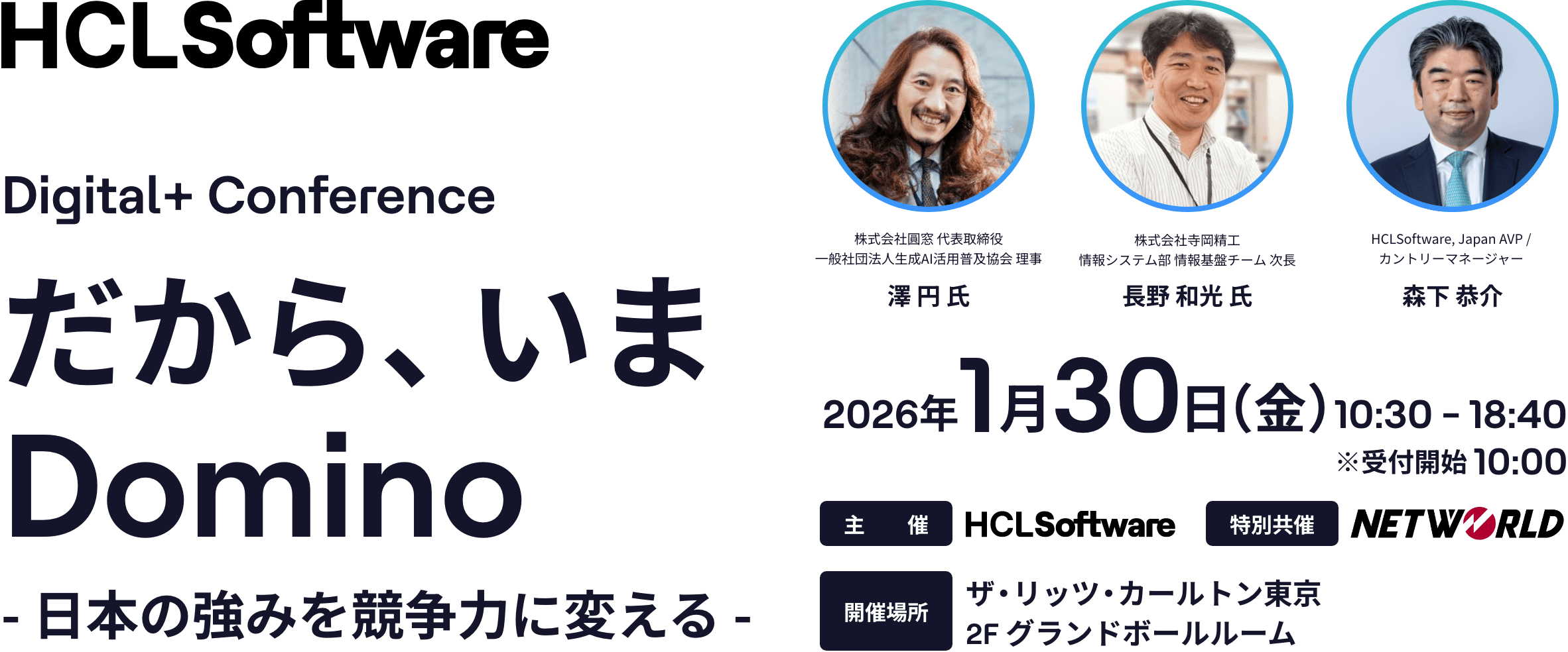 本イベントでは、AI時代におけるデータのセキュリティと活用方法、HCL Dominoと既存システムとの共存戦略、そしてHCL Dominoで競争優位を創り出しているお客様事例まで、「HCL Dominoで日本の強みを発展させる」新しいモデルをご紹介します。日本らしさを武器に、世界で戦うための次の一手を、ぜひお持ち帰りください。